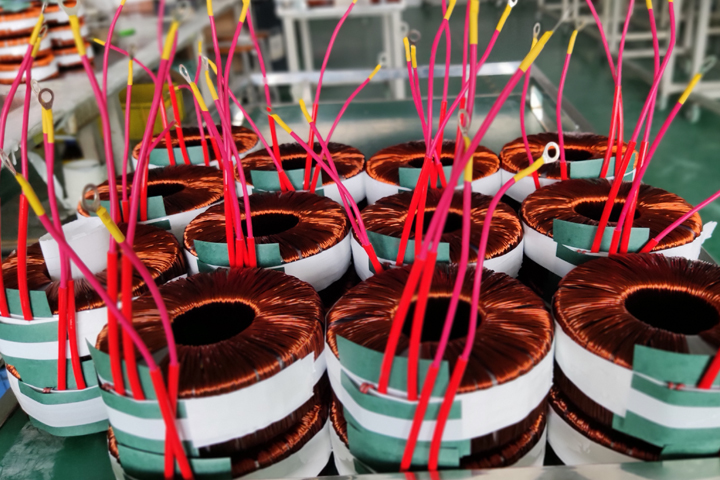 圣元的生產(chǎn)人員將纏繞好青稞紙的環(huán)形變壓器放在小推車上,等待下一步的完善。