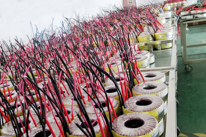 圣元環(huán)形變壓器經(jīng)過最后一道測試,暫時存放在小推車上,等待包裝。