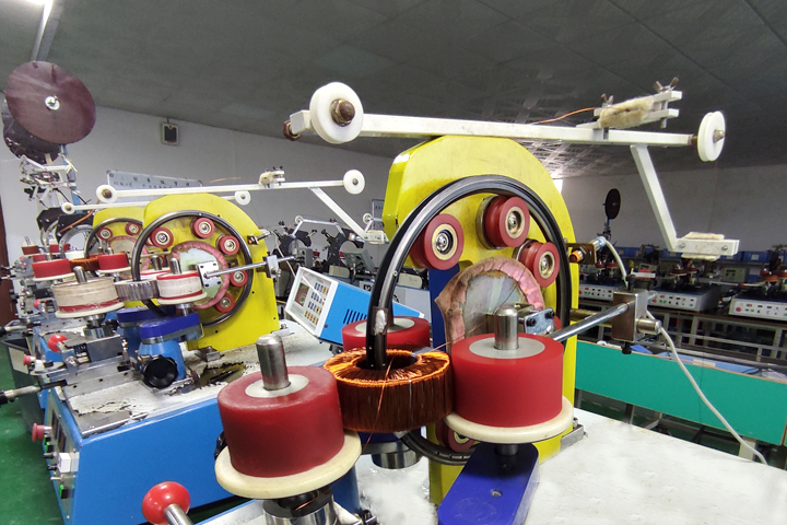 圣元變壓器的員工使用繞制機把銅線緩慢均勻地繞制在聚脂薄膜包裹好的鐵芯上。