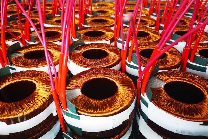 圣元電器的員工將制作好的的環(huán)形變壓器半成品整齊有序地?cái)[放好。