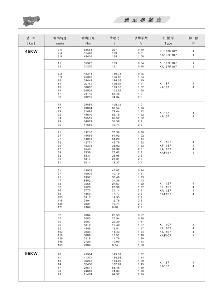 K螺旋錐齒輪減速機選項參數(shù)表45KW、55KW、75KW