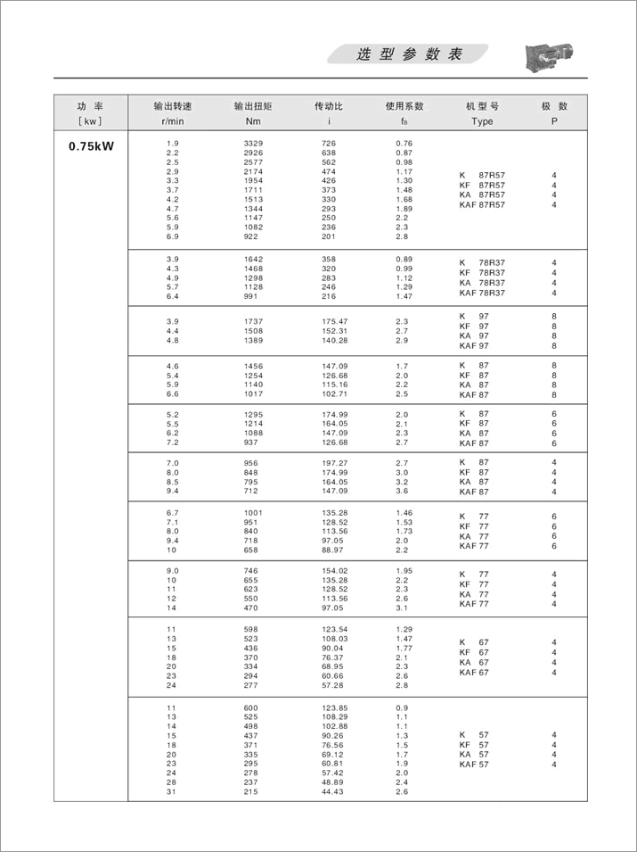 K螺旋錐齒輪減速機選項參數(shù)表0.75KW